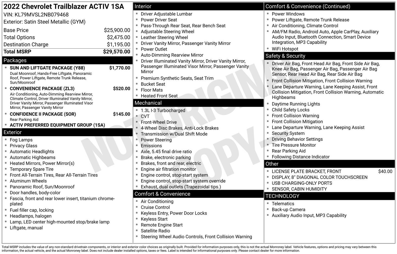 Carfax indicates only 1-Owner!!, TrailBlazer ACTIV, 4D Sport Utility, 1.3L Ecotec Turbo DOHC SIDI w/VVT, CVT, Satin Steel Metallic, Jet Black With Arizona Accents Artificial Leather, Dual-Pane Panoramic Power Sunroof, Exterior Parking Camera Rear, Fully automatic headlights, Hands-Free Power Programmable Liftgate, Heated Driver & Front Passenger Seats, Heated steering wheel, Rear Park Assist, Sun & Liftgate Package. CARFAX One-Owner. Clean CARFAX.